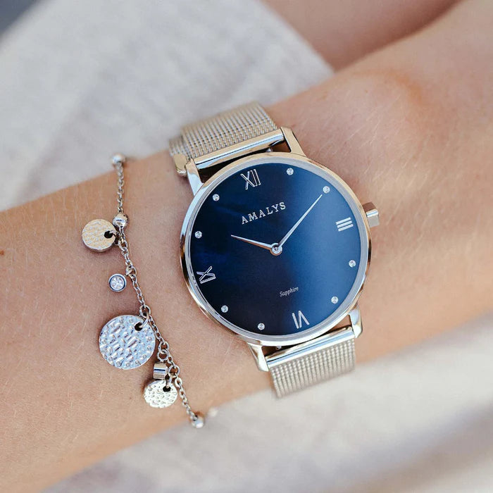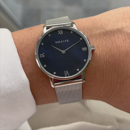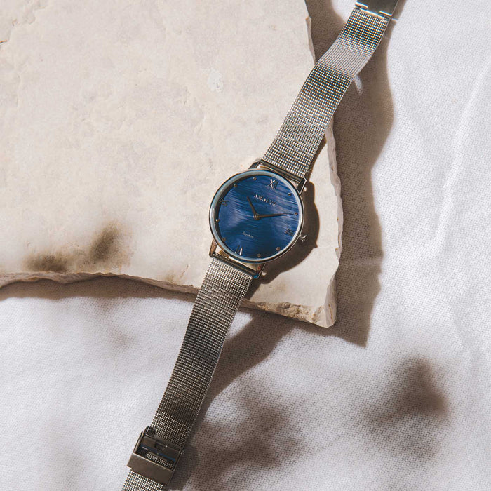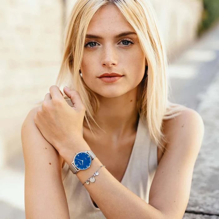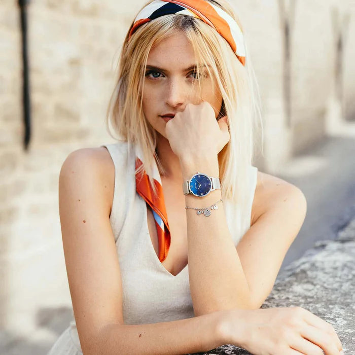 Aurore, all in silver with its pearly blue dial and subtle reflections, is definitely the accessory to have to complete your look.