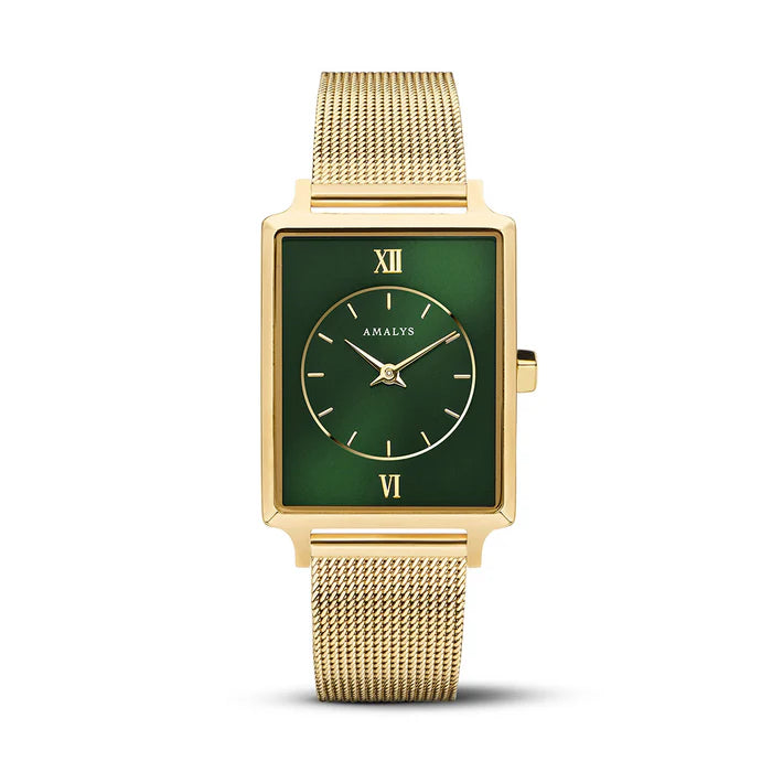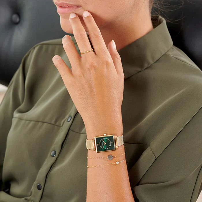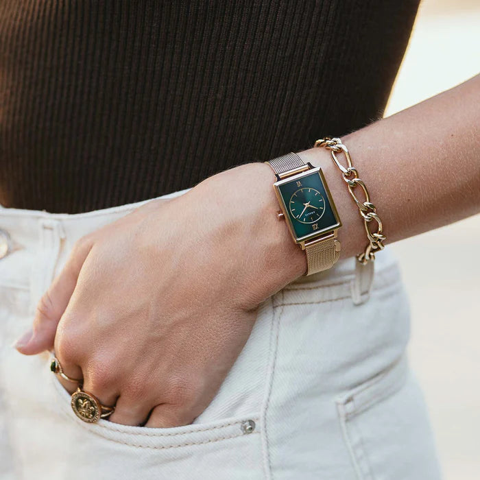 The Colette watch makes a bold statement for those who refuse to blend in. Its striking yellow gold case paired with a sophisticated dark green frame creates an unmistakable presence on your wrist. Built with premium 316L stainless steel and a reliable Japanese quartz movement, this timepiece delivers both style and substance. The mineral glass resists daily wear, while 3ATM water resistance handles everyday splashes. At 23 x 28 mm with a 14 mm bracelet, it sits perfectly on any wrist. Part of the prestigious Hepburn collection, the Colette comes with a comprehensive 2-year warranty, plus an additional year free when you register online. Express yourself with confidence.