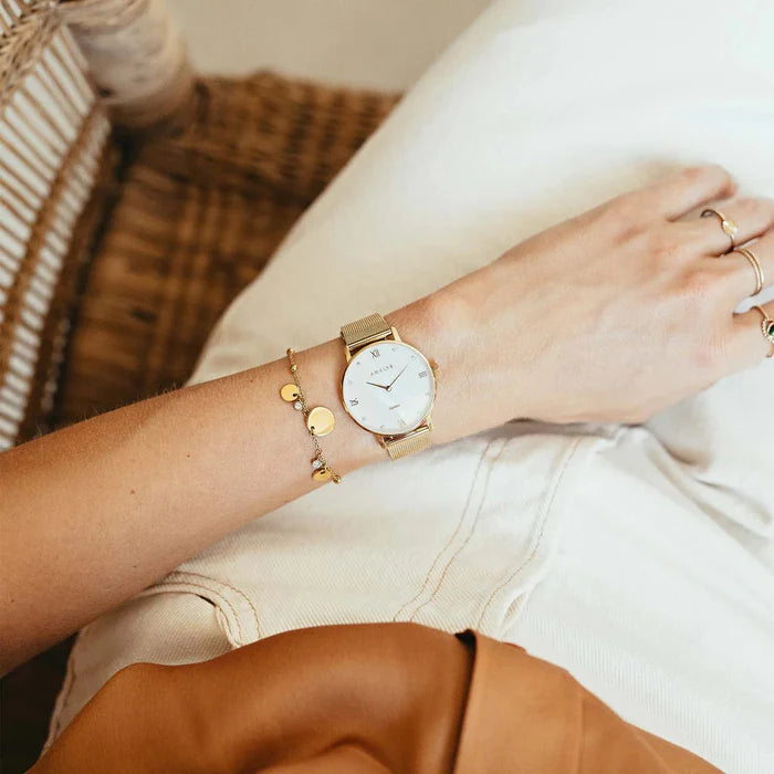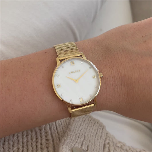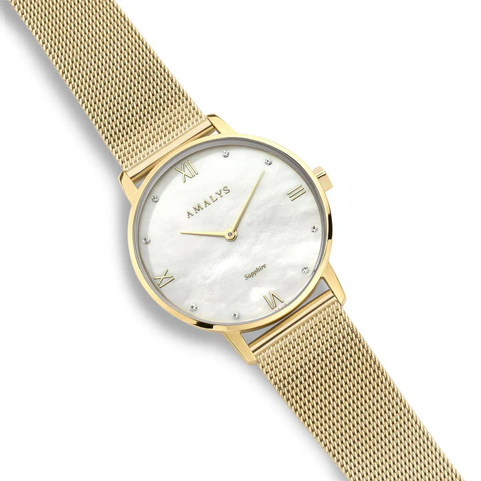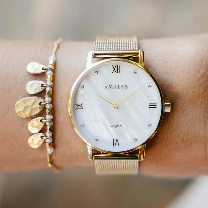 Diana, with its pearly white dial adorned with small diamonds and gold case, will brighten up all your outfits, from the simplest to the most sophisticated.