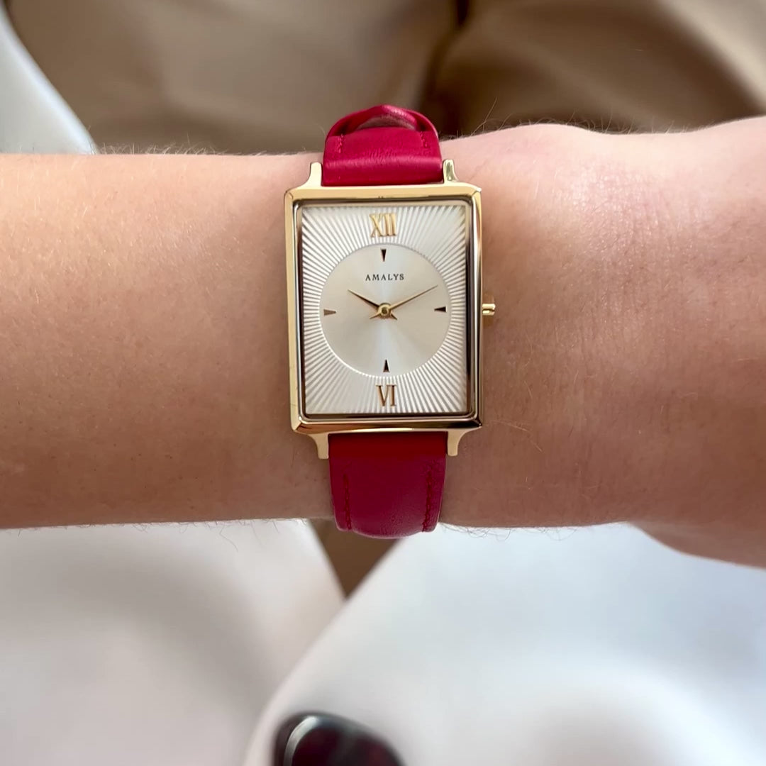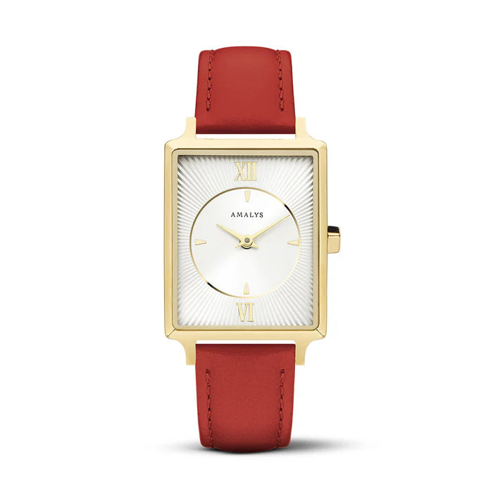 Elevate your everyday elegance with this sophisticated timepiece featuring a striking patterned silver-white dial set within a sleek gold-tone stainless steel case. The luxurious red Italian leather strap delivers refined style that transitions seamlessly from morning meetings to evening occasions. Built to last with Japanese quartz precision, mineral glass protection, and 3ATM water resistance, this watch combines timeless design with reliable performance. The 23 x 28 mm case sits comfortably on the wrist, while the 14 mm interchangeable bracelet width offers versatility to match your mood. Part of the prestigious Hepburn collection, it arrives with a comprehensive 2-year warranty, extendable to 3 years with online registration.