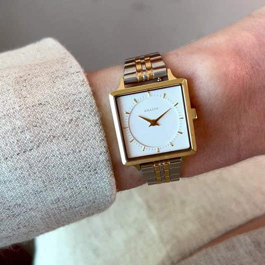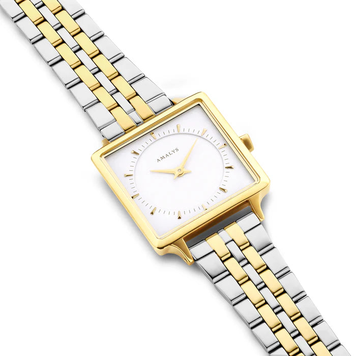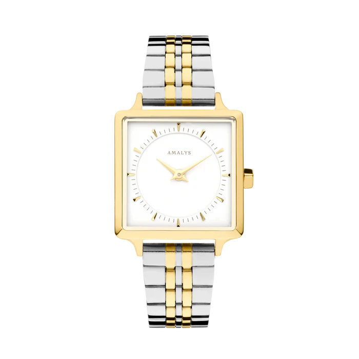 Elevate your everyday style with the Amalys Melody, a sophisticated timepiece that effortlessly commands attention. This refined two-tone link bracelet watch reimagines classic elegance with contemporary flair. Featuring a compact 25 x 25 mm stainless steel case, reliable Japanese quartz movement, and mineral glass protection, it's built to last. The 14 mm bracelet adapts to your lifestyle with interchangeable options, while 3ATM water resistance keeps pace with daily wear. Part of the prestigious Parks collection, the Melody arrives with a comprehensive 3-year warranty (2 years standard plus 1 additional year upon online registration). Timeless design meets practical durability.
