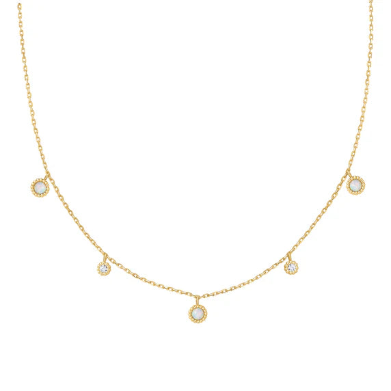 Embrace colour, light, and playful styling with Sunny Sparkler. Perfect for casual outings and relaxed days, this necklace adds a dreamy touch to any outfit. With delicate Kyoto opal stations set in a sleek chain, it brings a touch of elegance and whimsy. Layer it with other necklaces for a romantic look, or wear it alone for a subtle sparkle. It also makes a perfect gift.