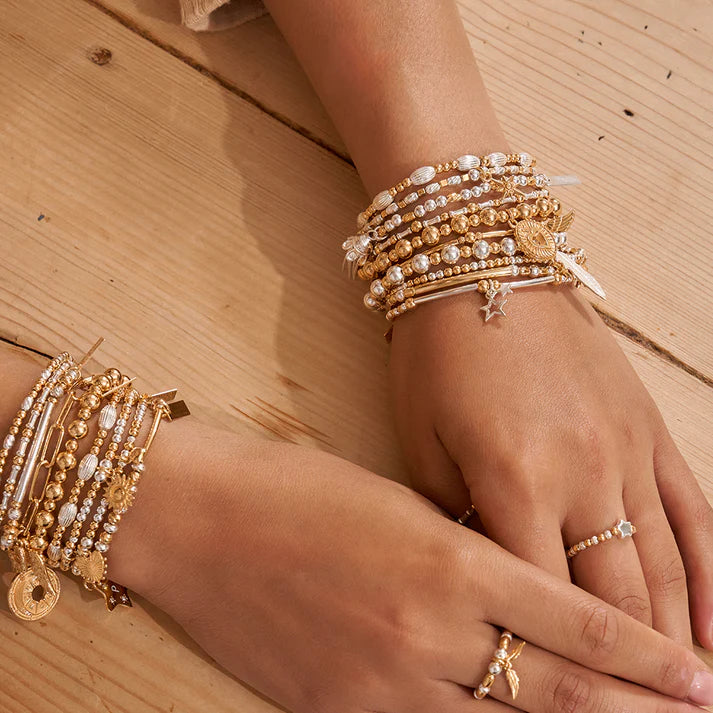 The Mixed Metal Double Star Bracelet is an elegant 18cm piece featuring delicately crafted beads in varying metal tones. Each bracelet is handmade, ensuring unique charm with slight variations in bead size. Perfect for wearing solo as a refined statement or stacked with other pieces, it effortlessly enhances your look with a subtle celestial touch.