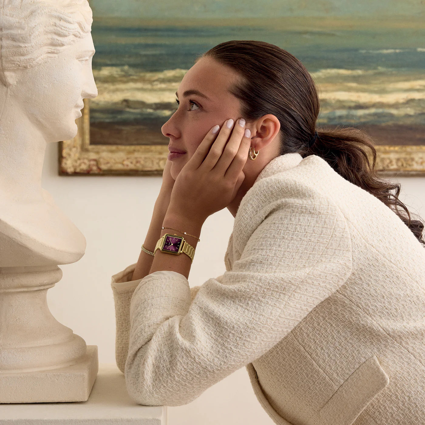 The square La Tétragone watch for women features a 28.5 mm gold coloured case, wine red dial embellished with gold coloured stones on the dial and a gold coloured 16 mm stainless steel strap.