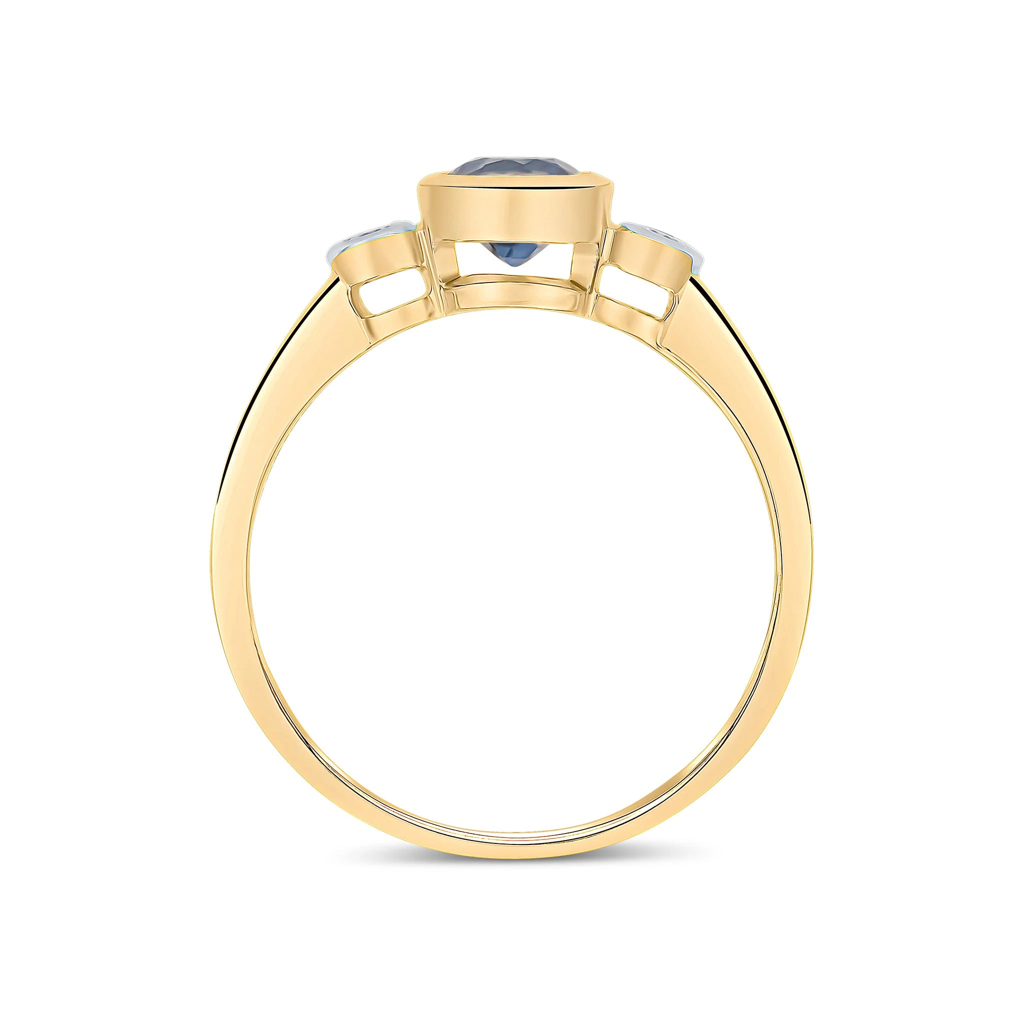 Timeless elegance meets classic romance in this exquisite three stone ring. Crafted in lustrous 9ct yellow gold, it features a stunning 5mm round sapphire (0.58ct) as the centrepiece, flanked by two sparkling round diamonds (0.05ct total). The rich, deep blue of the sapphire symbolises devotion and sincerity, while the diamonds catch the light with every gesture. Perfect for engagements, anniversaries, or as a meaningful gift to celebrate your most cherished moments together.