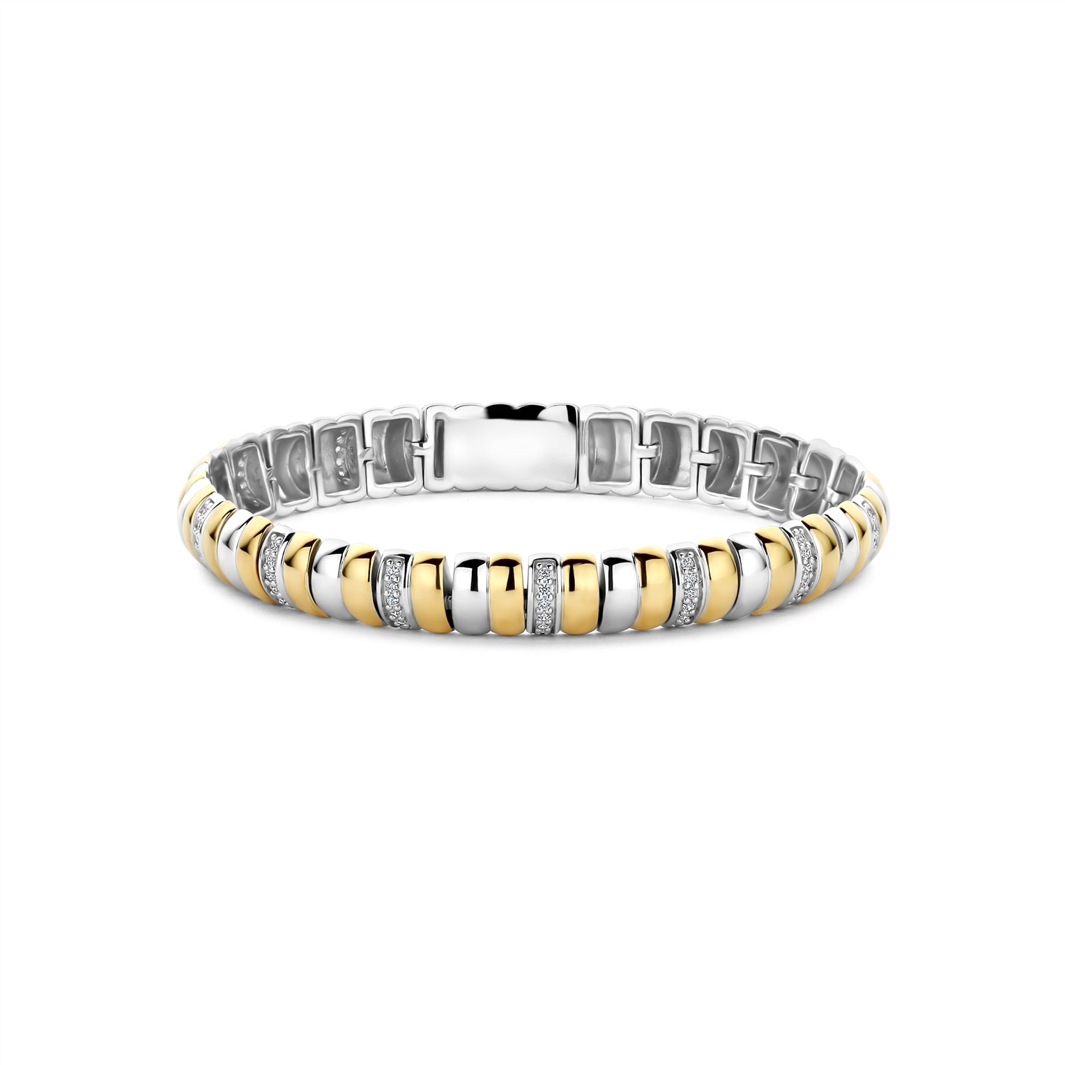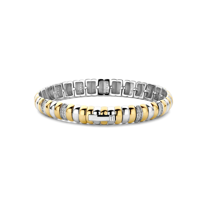 Elevate your everyday style with this stunning Ti Sento two-toned ribbed bangle, where sophisticated design meets versatile elegance. The striking interplay of gold and platinum plating creates a captivating visual rhythm that complements any look. Crafted with a secure concealed clasp, this silver bangle offers both security and seamless aesthetics. Whether you layer it with other pieces for a curated stack or let it shine independently, this timeless accessory delivers the refined polish your collection deserves.
