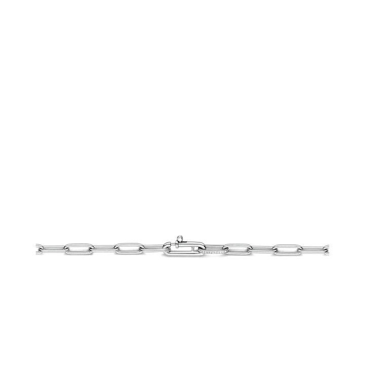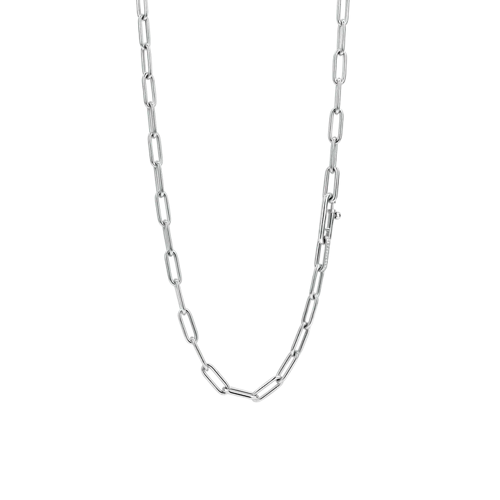 This TI SENTO silver necklace 3947ZI/48 has a stream of small 925 sterling silver links. The handset zirconia on her centrepiece safety-lock adds a touch of sparkle. She has a thick layer of platinum to protect her and keep her shining. Create your own artwork by clipping on small or larger pendants. This necklace is available in different lengths (48 en 80 cm). The model is wearing length size: 42 cm.